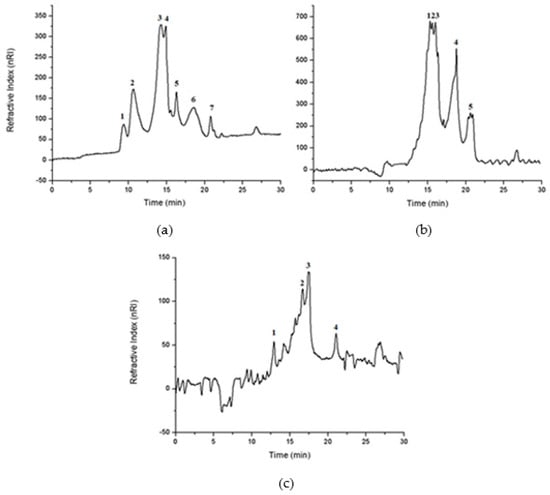 Double gel permeation chromatography (GPC) chromatograms of starch extracted by (a) MAE with OC, (b) with OC NO–ISO and (c) starch isolated by CONV.