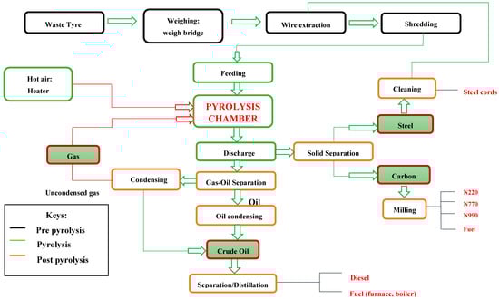 South Africa is burdened with 30 million waste tyres that are either landfilled or illegally dumped in open fields [1]. The generation rates are escalating at a rate of approximately 200,000 tonnes, equating to a million waste tyres annually [2]. In the 2016/2017 financial year, The Department of Environmental Affairs (DEA) reported that 31% of waste tyres have been diverted from landfills to be repurposed in reuse, recycling, and material or energy recovery industries [1]. In addition, through the Recycling and Economic Development Initiative of South Africa (REDISA), approximately 170,000 tonnes of waste tyres were recycled in 2016 [3]. In 2013, approximately 16,037 waste tyres were channeled to recycling, recovery, and reuse initiatives. Subsequently, in 2014 and 2015, the recorded figures of waste tyres allocated to recycling, energy recovery and reuse initiatives were 31,448 and 71,806, respectively [3], showing a significant increase over the years. South Africa is successfully directing waste tyres to different markets of which 25% of waste tyres are reused, 23% are designated for cutting and shredding to be used for spongy mats or playground material, 18% are converted to oil and carbon black through pyrolysis for various applications, and 16% are incinerated for energy recovery in cement or brick manufacturing kilns [3]. The remainder, which is about 18% of waste tyres, are redirected to landfills; this is still very high, and it gives more evidence to the case for repurposing more waste tyres. The characteristics of tyres, waste tyre pyrolysis, the associated primary and valuable secondary products, and the waste tyre management challenges have been comprehensively discussed by several authors in the literature. Muzenda [4] comprehensively detailed the various thermochemical processes such as pyrolysis, gasification, and liquefaction that waste tyres can undergo. The literature was utilised to formulate a detailed understanding of the different thermochemical technologies. Rodriguez [5], Islam [6], and Williams [7] discussed the waste tyre pyrolysis process in great detail as well as the different forms of products that the process can yield. Furthermore, Parthasarathy et al. [8] investigated the effect of process conditions on the product yield of waste tyre pyrolysis. Laresgoiti et al. [9] critically analysed the gases obtained in tyre pyrolysis; Cunliffe and Williams [10] as well as Islam et al. [11] assessed the composition of oils resulting from the pyrolysis of tyres, and Shah et al. [12] examined waste tyre-derived carbon black and its use as an adsorbent. The referenced literature has assisted the authors with the understanding of waste tyre pyrolysis chemistry, final product quantity, and quality as well as possible markets and applications. This paper aims to assess the economic viability of operating a waste tyre batch pyrolysis plant as well as the potential of producing high-value primary and secondary final products. This can significantly contribute towards addressing South Africa’s waste tyre challenges, energy, and material recovery, thus contributing to socioeconomic development. In addition, this study taps into the current socioeconomic ills currently experienced in South Africa, such as unemployment and the lack of successful small medium and micro enterprises (SMMEs) [13]. The results of this study can also be adopted by developing countries such as Thailand, Nigeria, and Brazil, who also face the same waste tyre problem as South Africa. In 2012, Thailand reported the energy recovery of waste tyres in the form of pyrolysis to be at 30.23% [14]. Similarly, Nigeria and Brazil are assessing the socioeconomic benefits to be derived from waste tyre management. Waste tyre pyrolysis is yet to be fully explored in these countries [15,16].