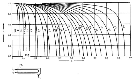 Temperature correction factor: two shell passes, four or multiples of four tube passes [41].