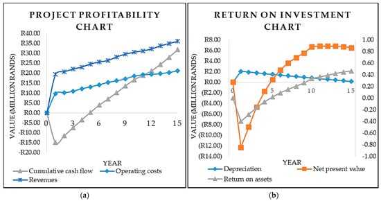 Figure 4b provides the profitability predictions of the project; it shows stabilisation in the accumulated annual revenue and production costs towards the end of the project. This is expected, as a high increase in revenue is realised from year 5 onwards. The net present value (NPV) of money has also been used to determine whether the project is a worthwhile investment, in terms of profit yield and breakeven period. In this regard, Figure 4b shows that the project is worth investing in due to the NPV proceeding from being negative to being positive over the increasing duration of the project; this is also depicted in Table 8. In addition, the NPV curve also indicates the projected plant life, which agrees very well with the plotted plant life curve given in Figure 4a. The return of assets (ROA) curve in Figure 4b is also in agreement with the NPV and shows an increasing trend in Table 8. The project is shown to gradually depreciate over time from year 1 to year 15 at an acceptable rate. This is highly influenced by the scheduled plant maintenance, which will ensure proper plant preservation and the regular servicing of all plant equipment. According to [41], 20% to 30% for the rate of return (ROR) can be used roughly as a guide for evaluating small projects and the higher a project’s return, the more attractive it is [41]. The ROR for this project is projected to be 31.9%, as shown in Table 8; this figure is in strong agreement with the literature, thus confirming that the project is a viable investment that will yield profits and longevity during its projected lifespan.