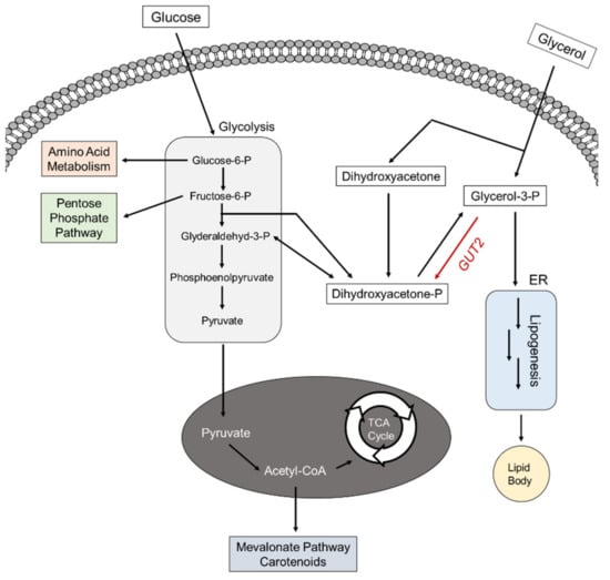 Simplified overview of glucose and glycerol metabolism in Yarrowia lipolytica with key metabolites highlighted. GUT2 = glycerol-3-phosphate dehydrogenase. Figure based on results from: [58,59].