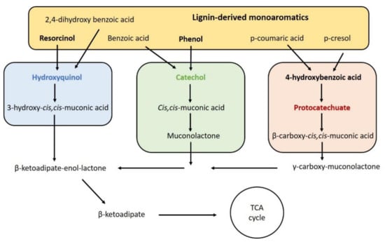The microbial conversion of plant-derived phenolic compounds to aromatic compounds is known as “biological funneling”. The three main funneling pathways for aromatic metabolism are the hydroxyquinol, catechol, and protocatechuate pathways (Figure 2). Allison et al. selected resorcinol, phenol and 4-hydroxybenzoic acid (pHBA) as representative compounds for each of the funneling pathways, based on their relatively low minimum inhibitory concentration (MIC) [72]. When T. oleaginosus was cultivated on each of these three model lignin-derived aromatics, the specific growth rates achieved using resorcinol and pHBA were very similar at 0.097 h−1 and 0.092 h−1, respectively, whilst the growth rate observed using phenol was lower at 0.058 h−1. As expected, the growth rate on all of the phenolic compounds was lower than that on the preferential glucose substrate (≈0.157 h−1) [72,73]. Despite this, the three compounds were completely consumed after just several hours of cultivation. Interestingly, in high nitrogen media lipid accumulation was enhanced for the resorcinol and pHBA cultures at 7.21 and 7.55 %w/w, whilst it decreased in equivalent phenol cultures (5.26 %w/w), compared to the glucose control (6.72 %w/w) [74].