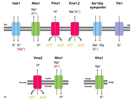 Although halotolerance is not yet completely understood in D. hansenii, the role of several membrane transporters and pumps in osmotic stress tolerance has been demonstrated. Figure 3 shows a schematic overview of the main transport systems and pumps involved in the maintenance of the intracellular osmolarity in D. hansenii. By transporting Na+ and K+ into the cell, H+-ATPases minimize excess H+ accumulation in the cytosol. Examples of H+-ATPases include, DhPma1 and DhVma2, which are located in the cell membrane and vacuole, respectively [100]. Two additional transport systems are used to extrude Na+ out of the cell: DhNha1, an active Na+/H+-antiporter [101], and DhEna1/DhEna2, which actively secretes Na+ by consuming ATP [102]. DhENA1 is expressed at high Na+ concentrations, whilst DhENA2 is only transcribed under high pH conditions. In addition, DhNhx1 and DhKha1 are H+/K+-antiporters described to decrease the cytosolic Na+ concentration by transferring Na+ into vacuoles and the Golgi apparatus respectively [103,104]. Due to their importance in cell performance, a further two K+ transporters have been identified in D. hansenii, DhHak1 and DhTrk1. DhHak1 is a K+/H+-symporter, which may also function as a K+/Na+-symporter in the presence of Na+. DhHAK1 (High Affinity K+ transport), on the other hand, is expressed only when the ion concentration is low [105]. As the K+ concentration increases, DhHAK1 is repressed and K+ uptake is then performed by DhTrk1 [106]. Finally, a Na+/glycerol-symporter has been also studied [107], using this symporter, D. hansenii is able to accumulate glycerol and use it as a compatible solute, as aforementioned. In the absence of Na+, K+ may also function as a co-transporter with glycerol.