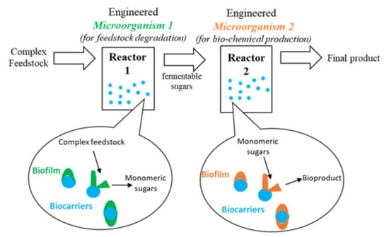 This concept is often employed in biogas plants; hydrolysis and acidogenesis take place first in a smaller tank, followed by methanogenesis in a larger tank [111]. This method could be adapted for the production of bio-commodities from lignocellulosic biomass. The system would be comprised of two vessels, reactor 1 and reactor 2, as depicted in Figure 4. In the first reactor, an engineered organism efficiently breaks down the raw lignocellulosic feedstock into fermentable sugars. The resulting product, consisting largely of monomeric sugars, is subsequently fed into reactor 2 where it is converted into the product of interest by a second engineered microorganism. Biofilm reactors can be used for this application to enhance performance, here the microorganisms attach to the surface of small beads as they grow and are retained in their respective reactors [112,113]. In the case of continuous bioreactor configurations, determination of the optimal dilution rate (D) and reactor volumes must consider both microorganisms, a compromise may therefore be necessary to maximize overall performance. A major issue associated with the proposed configuration is substrate consumption in the first reactor. The purpose of the microorganism in the first reactor 1 is to hydrolyze complex substrate to release simple sugars. However, care must be taken to minimize consumption of the resulting sugars and maximize availability for the second microorganism. Two possible strategies could be used to overcome this issue: