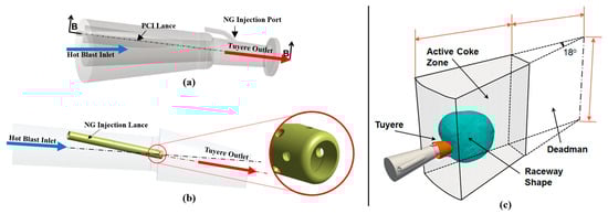 (a) Blowpipe and tuyere region simulation domain for co-injection blast furnace (BF); (b) Blowpipe and tuyere region simulation domain for natural gas (NG)-only BF; and (c) Generic raceway region geometry with tuyere and blowpipe position included.