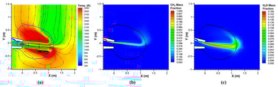 (a) Gas temperature contours and flow streamlines for the baseline co-injection BF raceway (raceway boundary shown in blue); (b) Contours of CH4 mass fraction; and (c) Contours of H2O mass fraction.