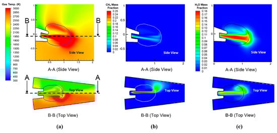 Side view (top) and top view (bottom) of contours of (a) temperature; (b) CH4 mass fraction contours; and (c) H2O mass fraction in the raceway region for the NG-only BF baseline case (raceway boundary shown in blue or white).