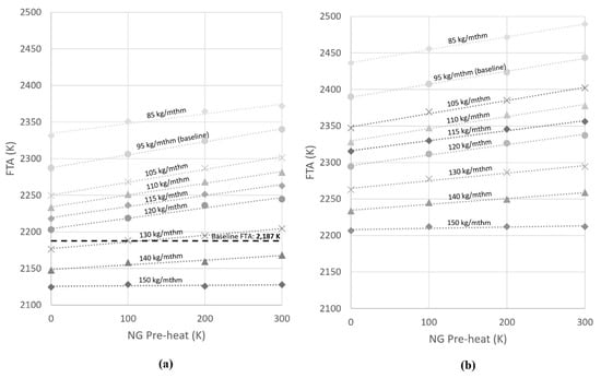Predicted FTA vs. NG pre-heat for (a) the 32% O2 enrichment scenario; and (b) the 35% O2 enrichment scenario.