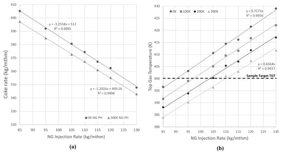 (a) Predicted BF coke rate for 0 K and 300 K NG pre-heat vs. NG injection rate; and (b) Predicted average top gas temperature for all NG pre-heat levels vs. NG injection rate.