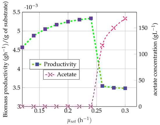 In order to maximize productivity and to avoid acetate accumulation throughout fermentation, it is important to maintain the substrate concentration to a certain threshold corresponding to the critical oxidation capacity [], inducing the necessity to design a closed-loop feeding strategy. Several control strategies have been developed for similar fed-batch processes presenting overflow metabolism [,,,,].