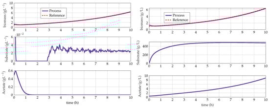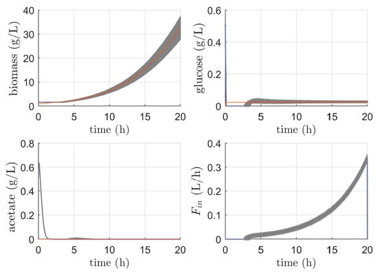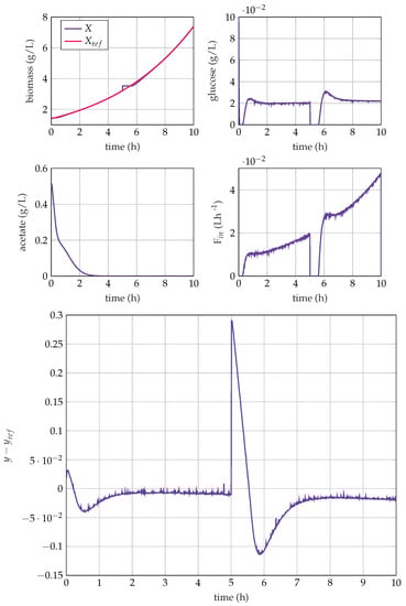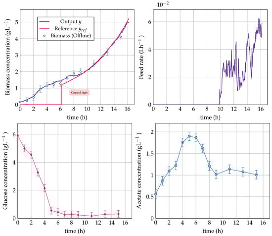 Accurate control of the substrate or acetate concentrations at low values may seem a straightforward approach since the process is close to the edge between the respiro-fermentative and respirative modes, where the majority of the available substrate is dedicated to biomass production. Some applications of this approach can be found in [,,,]. However, the lack of reliable online monitoring of acetate and glucose at low concentrations is a major hurdle for the experimental application of these methods. Additionally, the nonlinearity exhibited by the process and the need for an accurate determination of the stoichiometry and the kinetics are drawbacks in the application of model-based control strategies. Therefore, an adaptive control scheme with minimum reliance on stoichiometry and kinetics and considering online measurements of substrate and acetate can be an attractive alternative.
