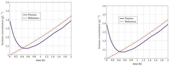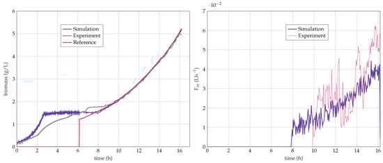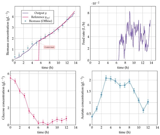 The imposed reference trajectory is h, and the algorithm is launched with an initial biomass concentration lower than the measured one to avoid excessive feeding at the start of the fed-batch. In Figure 14 and Figure 15, the biomass maintains an exponential growth close to the reference trajectory, showing that the regulation is efficient. The glucose concentration remains close to zero and almost constant during the fed-batch phase of both experiments, confirming the fast dynamics assumption presented in the model reduction section .
