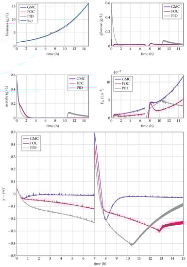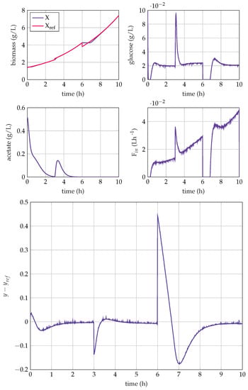 Generic Model Control (GMC) was developed by Lee and Sullivan [] and is an adaptive control strategy based on feedback linearization, embedding the process nonlinearities in the design of the control law. GMC was used in various process control applications, among which we can cite, for instance [], where GMC ensured tracking of the foreign protein level reference trajectory in E. coli fermentations [], where it was applied to anaerobic digestion; and [], where GMC was used to control dual product composition in an industrial high-purity distillation column. More specifically, in relation to the present study, the GMC strategy was applied in [] to control the specific biomass growth rate in recombinant E. coli fed-batch cultures to an experimentally defined specific growth rate reference . Model simplification was carried out during the control design. In the same spirit, a control strategy was developed in [] and applied in [], based on an adaptive linearizing control law, regulating the acetate concentration with the dilution rate as a manipulated variable.