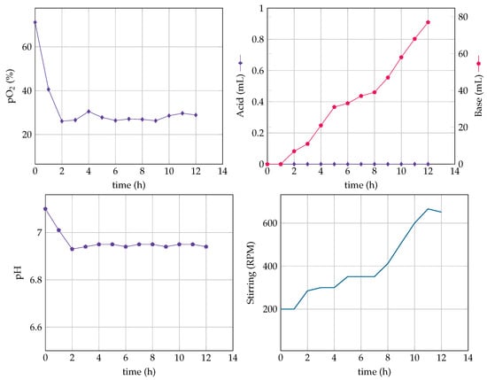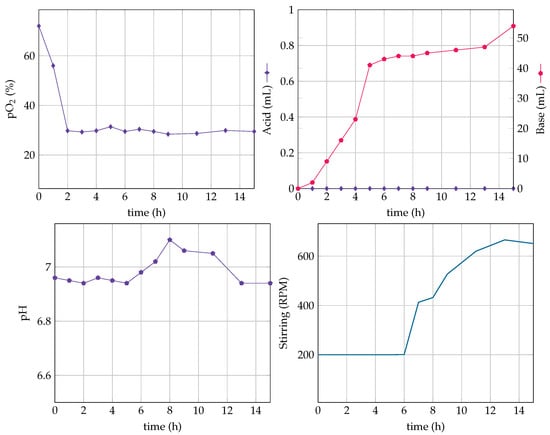 During the fermentations, the initial biomass concentration ranged from 0.1–0.3 gL and reached 1.5–1.7 gL by the end of the batch phase, characterized by glucose depletion. The online flag for the end of the batch phase was the sudden increase of the pH and, consequently, the decrease of base addition, as can be seen in Figure 16 and Figure 17. The fed-batch phase starts around 6–8 h of culture time, and the control algorithm is launched. During this period, the RPM increases due to the important glucose oxidation inducing an increasing cell demand for oxygen. The base is added to compensate the pH decrease.