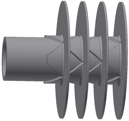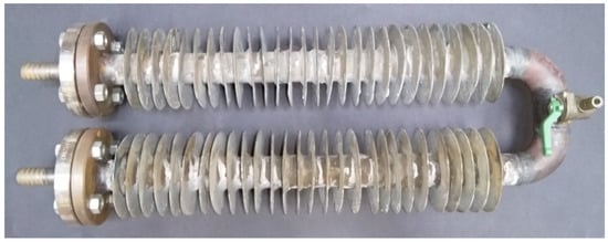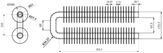 The design and dimensions of the heat exchanger are shown in Figure 3. The tube and the fins were made of carbon steel. Later in the calculations, referring to literature and standard data, the heat conductivity was assumed to be 54 W/mK (according to EN 1993-1-2:2005, for carbon steel). The inner and outer diameters of the tube were = 31 mm and = 37.5 mm respectively; the length of the tube was L = 502.5 mm. The thickness of the fins was = 1.75 mm, the diameter of the fins was D = 100 mm and the space between the fins was = 14.65 mm.