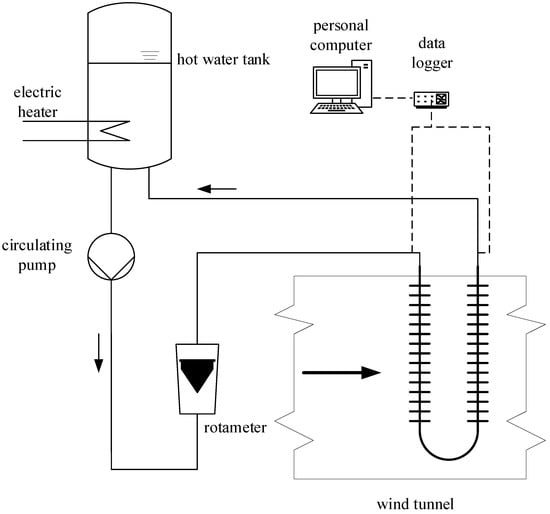 The investigated finned tube heat exchanger shown in Figure 1. The 80-l hot water tank heated by electricity produces and stores the hot fluid. The hot fluid was water, and its temperature was 60 C. This hot fluid is circulated by a pump in a 3/4 hoses and flows through a rota-meter, which detects the volume flow rate. After the rotameter fluid goes through the heat exchanger. Exiting the heat exchanger, the cooled liquid returns to the water tank. The experimental setup is shown in Figure 2.