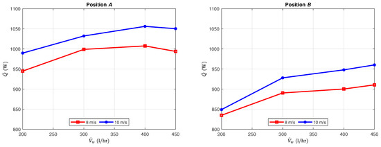 Figure 5 shows the results of the measurements. In every case, the measurement took two minutes after the steady state with a 5 Hz sample rate in positions A, B and C, as shown in Figure 4. The graphs show that in positions A, when the higher temperature water comes into contact with the air first, the heat performance will be a higher than in position B. This is explained by the fact that at this position the temperature difference (LMTD), in other words the driving force, will be larger. The heat performances experienced in the cross-current case (position C) are roughly the same as in the quasi-counter current case (position A).
