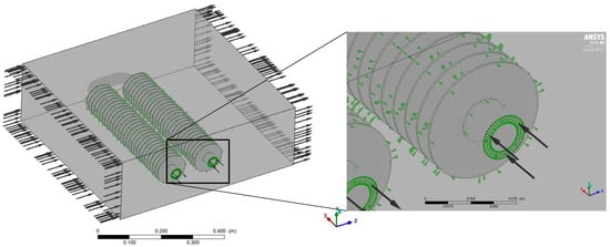 As mentioned, the fins and the tube were modeled as solid domains, and the material properties were set up for steel. The air and the water were modeled as fluid domains, and the SST (shear stress transport) turbulence model was set up for both materials. In order to calculate heat transfer through the different computational domains, interfaces had to be set up. These interfaces are indicated by green arrows in Figure 6.