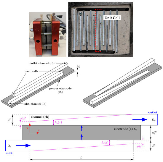 Considering the above hierarchy of scales, a 2D CFD model is used here to facilitate the analysis and reduce computational cost, while still retaining the main physics of the problem. A detailed study would require the use of 3D geometries to account for the effective channel-to-channel distance, but this is out of the scope of this work, which seeks to understand the role of the main parameters governing the fluid-dynamic problem. The 2D geometry is shown in the bottom panel of Figure 1, where , being x and y the Cartesian coordinates in theaxial and transverse direction, respectively. The fluid enters the system through the inlet channel, , which runs in the x-direction parallel to the porous electrode. In the domain of interest, , hereafter referred to as the flow-through section, the height of the inlet channel decreases gradually from its initial value, , to the dead-end height, . Similarly, the height of the outlet channel, , located at the opposite side of the electrode, grows gradually from the dead-end height, , to its final value, . To facilitate the analytical treatment, the analysis is restricted to cases where the height of the inlet and outlet channels are equal, , so that the pressure gradients in the channels upstream and downstream the flow-through section are equal. The inlet and outlet channels have a trapezoidal (i.e., tapered) geometry given by the following expressions
