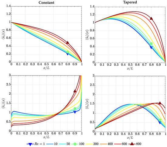 Figure A2 and Figure A3 show the streamlines for the cases and (), corresponding to the constant cross-section (left panel) and tapered (right panel) flow fields at different Reynolds numbers, .