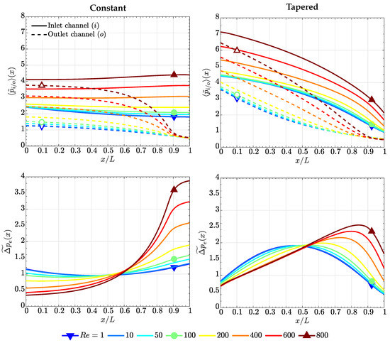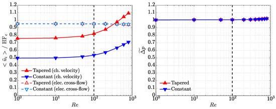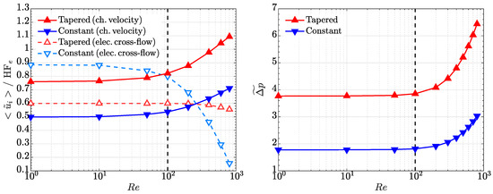 The main global differences between both flow fields are shown in Figure 4. The left panel shows the variation of the average channel velocity and the homogeneity factor of the flow across the electrode as a function of , while the right panel shows the variation of the overall pressure drop as a function of . As can be seen, the dimensionless channel velocity and pressure drop in both flow fields remain approximately constant for –100, and increase quadratically for –800. The channel velocity and pressure drop are about 1.5 and 2 times higher in the tapered flow field in the full range. Two regimes are also differentiated for the homogeneity factor depending on . For –100, the homogeneity factor remains almost constant, being significantly higher in the constant cross-section flow field ((constant) vs. (tapered) ). As discussed before, this is caused by the preferential crossflow accumulation towards the middle of the channel in the tapered flow field. However, for , the homogeneity factor in the constant cross-section flow field drops strongly due to the effect of inertia, while it only varies slightly in the tapered flow field ( at ). As a result, the homogeneity factor of the constant cross-section flow field becomes lower than that of the tapered flow field for , reaching values as low as at .