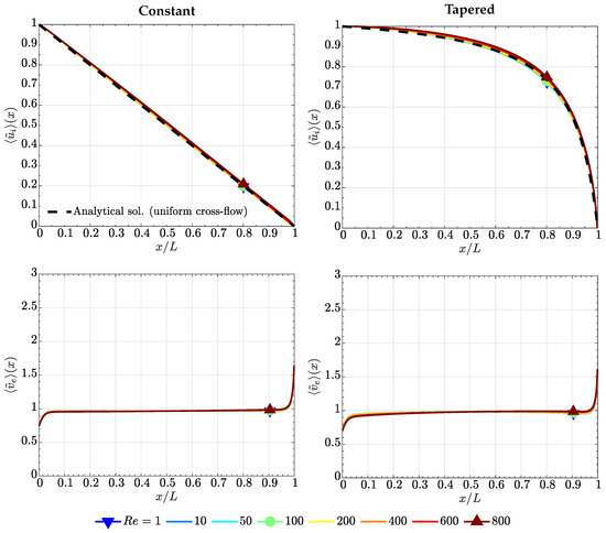 Variation of (top) the y-averaged axial velocity in the inlet channel, , and (down) the y-averaged transverse velocity in the electrode, , as a function of the along-the-channel coordinate, , for –800, corresponding to (left) the constant cross-section and (right) the tapered flow fields. Electrode permeability, , and .
