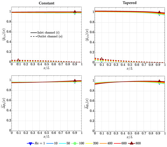 Variation of (top) the y-averaged pressure in the inlet and outlet channels, , and (down) the pressure drop across the electrode, , as a function of the along-the-channel coordinate, , for –800, corresponding to (left) the constant cross-section and (right) the tapered flow fields. Electrode permeability, , and .