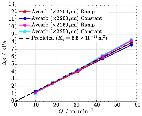 Pressure drop, , as a function of the feed flow rate, Q, measured in a VRFB with constant cross-section and ramped interdigitated flow fields, including different AvCarb carbon-paper electrodes. The black dashed line shows the predicted pressure drop across the electrode for ().