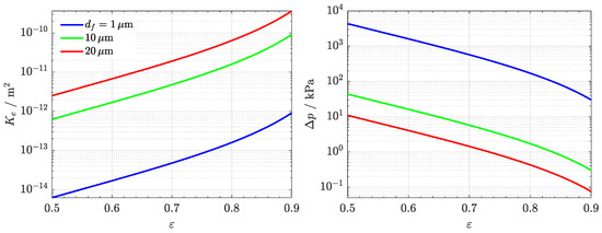 Variation of (left) the permeability of the electrode, , and (right) the overall pressure drop, , as a function of the porosity of the electrode, , for various fiber diameters, . The permeability is estimated according to the Carman–Kozeny equation (Equation (24)).