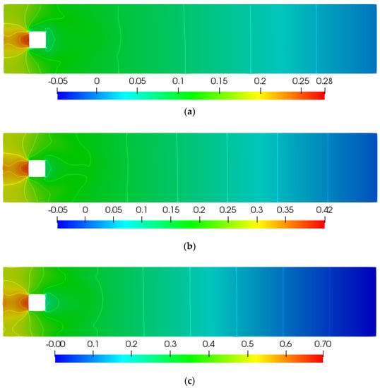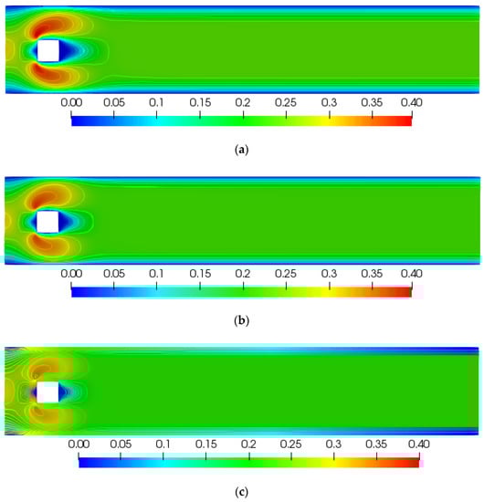 The simulation domains are schematically shown in Figure 1a,b. To be more specific, Figure 1a provides the domain as a rectangular channel with a circular cylinder and Figure 1b is specified with the square cylinder as an obstacle. The center of both the cylinders is set at C (0.2, 0.2). The structure of both meshes at the coarse level is shown in Figure 2. The velocity of the fluid at the upper and lower walls is taken as zero. A parabolic profile is exposed at inlet while the Neumann condition is carried at an outlet.