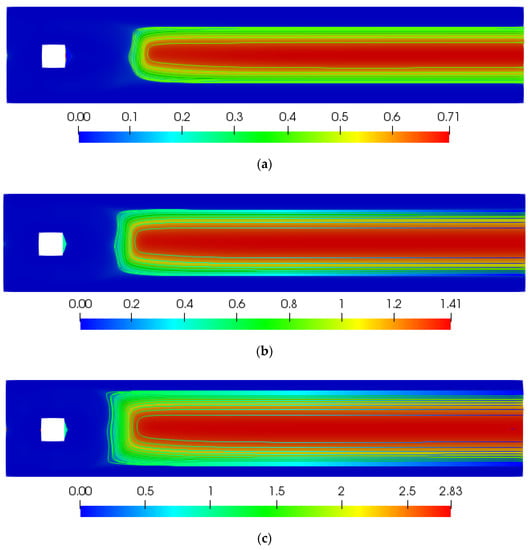 Figure 4, Figure 5, Figure 6 and Figure 7 provide the variation in pressure, velocity, viscosity, and streamlines, respectively when Bn = 5, 10, 20 and 50. In detail, Figure 4 pressure profiles in the channel are presented, where it is observed that the pressure shows non-linear variations in the vicinity of the obstacle and it becomes linear downstream the obstacle. The velocity magnitude is displayed in Figure 5 for the selected values of Bn. The parabolic profile given at the inlet gets a speedy bifurcation at the cylinder and then it declines in the center of the channel due to plasticity effects increased by augmentation in the Bingham numbers.