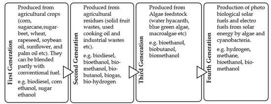 Bioethanol, biodiesel, and biogas are the main biofuel components of various agricultural biomasses produced from the different biochemical routes [8]. The first generation feedstock was produced from edible oils such as corn, sugarcane, sugar-beet, and others. Unlike the first generation of biofuels, second-generation biofuels targeted non-food biomass and agricultural residues [9]. Biodiesel originated from the first and second-generation of biofuels, as it is processed from agricultural crops and residues. Typically, the sources of biodiesel differ in many regions or countries. European nations use rapeseed due to the surpluses from edible oil production. On the other hand, soybean is commonly utilized for biodiesel production in the United States, which is becoming the main biodiesel-producing country [10]. Singh, V. et al., had summarized all classification of biofuels production starting from the first until the fourth generation as shown in Figure 1.