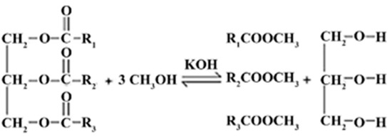 Transesterification of triglycerides with alcohol and catalyst [18].