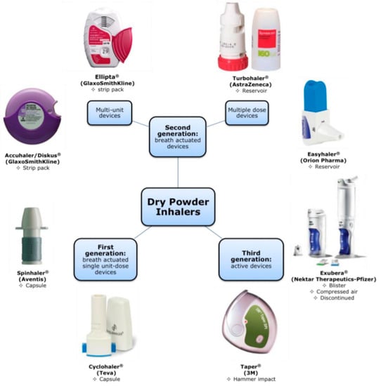 - Islam, N.; Gladki, E. Dry powder inhalers (DPIs)—A review of device reliability and innovation. Int. J. Pharm. 2018, 360, 1–11. [Google Scholar] [CrossRef]