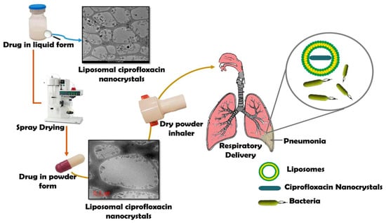- Khatib, I.; Khanal, D.; Ruan, J.; Cipolla, D.; Dayton, F.; Blanchard, J.D.; Chan, H.K. Ciprofloxacin nanocrystals liposomal powders for controlled drug release via inhalation. Int. J. Pharm. 2019, 566, 641–651. [Google Scholar] [CrossRef]