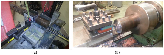 During the experiments, experimental tool and a tool for preparation of the surface was used. The experimental tool was a lathe holder with geometry, which was determined by STN ISO 3685, into which the tested cutting inserts were successively inserted. The tool for preparation of the surface was a conventional lathe holder with commonly used geometry, which was used to reprocess the surface of the machined material and ensure the same conditions for the test inserts before each transition. The view of the application of tools is presented in Figure 2.
