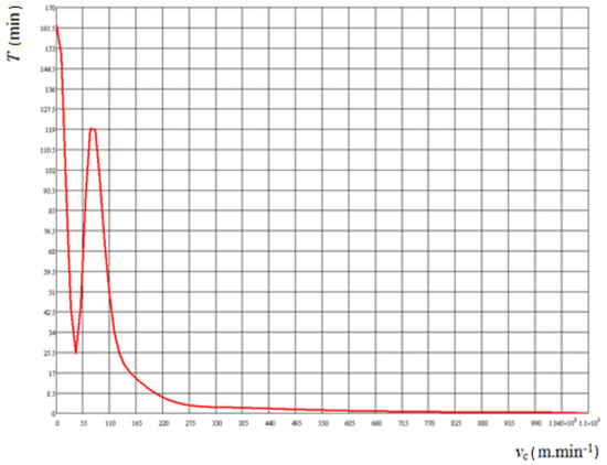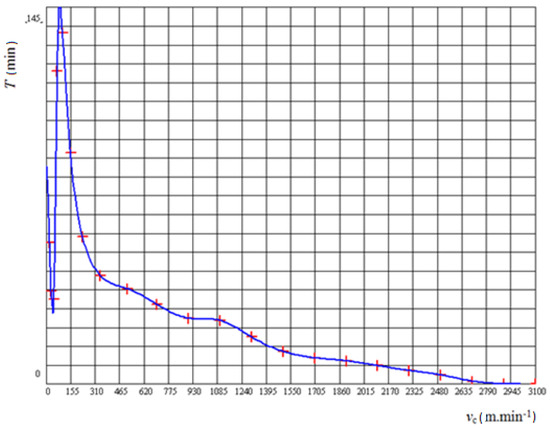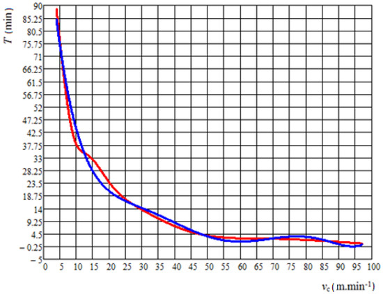 Figure 11, Figure 12, Figure 14 and Figure 15 show the red line values obtained from the experiment. In the area of lower cutting speeds (maximum for value up to 100 m/min) an increase in durability was recorded, due to the range of optimal cutting parameters for the given cutting tools. Subsequently, for cutting speeds with values higher than 100 m/min, a decrease in durability was recorded due to the values of the cutting parameters different from the optimal values. However, the aim of the experiments was to describe the whole course of available cutting parameters, not just optimal ones.