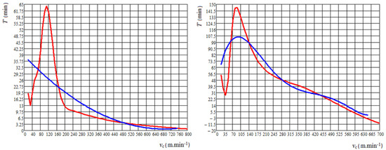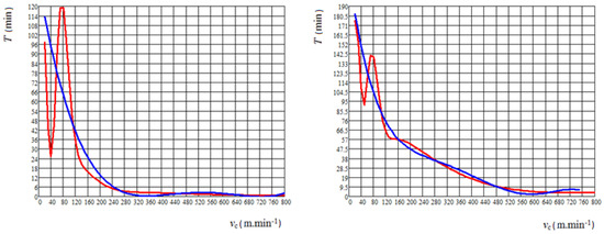 Regression analysis of T-vc dependence for P20 (left) and P20 + TiN (right)—CNC machine (red curve—values obtained from experiment; blue curve—values determined in accordance with ISO 3685).