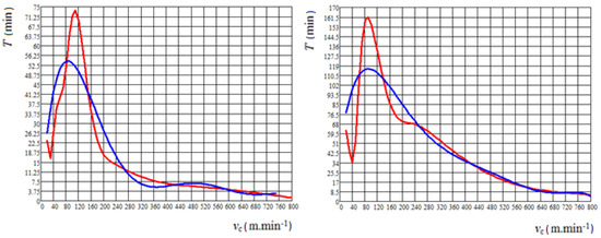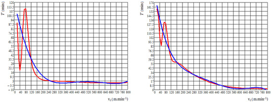 Final regression analysis of T-vc dependence (red curve—values obtained from experiment; blue curve—values determined in accordance with ISO 3685).