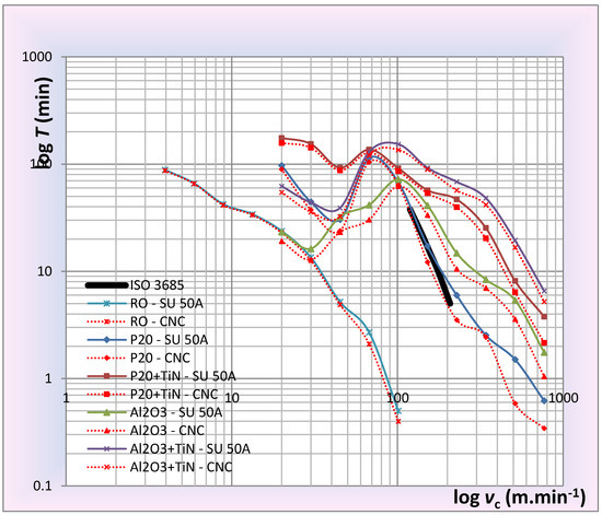 Due to the results of the experiments, it is evident that the statement of the STN ISO 3685 standard, which states that the cutting tool life depends on the cutting speed has a linear course in the logarithmic scale is not true. The standard outside of the measured areas recommends that the lines be extended, since the measurements were not performed, only estimated, which it is also not the correct recommendation given the results of the experiment. In Figure 20, the comprehensive T-vc dependence for all tested cutting materials in logarithmic scale is presented.