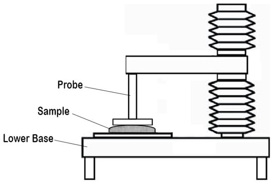 The value of stickiness was determined using a texture analyzer (TA.XT PLUS, Stable Micro Systems, Surrey, U.K.), with a 75 mm diameter cylinder probe (P/75P), and at pre-test speed of 0.5 mm/s, test speed of 0.5 mm/s, post-test speed of 10.0 mm/s, return distance of 5 mm, applied force of 5 g, contact time of 0.1 s, and trigger type of Auto-5 g [50]. Measurements were made on triplicate from each sample composition, with three measurements per replicate. The schematic diagram of the apparatus used to conduct the stickiness test is shown in Figure 1.