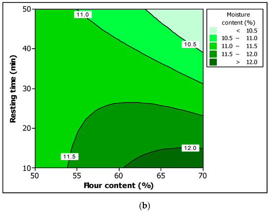 Except for the sample with 50% flour content, the moisture content decreases when the resting time increases, as shown in Figure 4b. Similarly, a high moisture content was recorded at 10 min resting time, and flour content between 55% and 70%. The high region moisture content was observed for flour content between 60% and 70%, and within 10 and 15 min for resting time. Moisture reduction is probably due to evaporation from the cookie dough, which is affected by the environment. Although water is a minor component in cookie batter formula, its rheological behavior and machinability are largely influenced by the water content, and its distribution within the batter [66,67].
