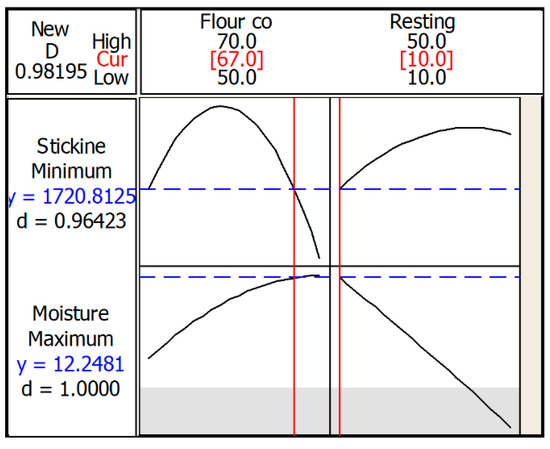 The optimization plot is shown in Figure 6. The purpose of conducting optimization is to obtain the best combination of flour content and resting time in producing the cookie dough with the minimum value of stickiness and the maximum value moisture content. The composite desirability value, D, was calculated to be close to 1, therefore the factors were within the working range. The optimized values of factors were flour content (V1) = 67% and resting time (V2) = 10 min. As compared to the control sample with 100% wheat flour, the control sample recorded low stickiness and moisture content at 668N and 11.51%, respectively. These results are in agreement with other studies, which obtained low stickiness [34] and low moisture content [74] for a sample with 100% wheat flour.