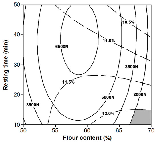 A method used to plot the overlaid graphs for various response surfaces is through the superimposition of the contour plots. This method is superior to the classical one-factor-at-a-time (OFAT) approach, which lacks the interaction of selected variables, and with experimental runs that are cumbersome [76]. The superimposed contour plots further serve as a reference template, which is easy to use in estimating the response for any given factor value within the range available. Figure 7 shows a feasible representation of the optimum range for the processing condition and formulation of cookie dough. The solid and dotted lines represent the contour line for stickiness and moisture content, respectively. Based on the overlaid contour plots, the optimum range for the lowest stickiness and highest moisture content (represented by the grey region) were found to be 67–70% flour content and 10–15 min resting time.