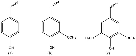 Monomeric phenols from the pyrolysis of lignin. (a) p-Hydroxyphenyl (H); (b) Guaiacyl (G); and (c) Syringyl (S) (adapted from [29]).