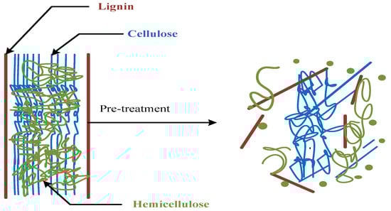 The pretreatment of biomass is the method that eases the pathways of the conversion of biomass into valuable products. It enhances the process selectivity for certain products as it makes the biomass polymers more accessible by opening up the polymer fibers to enhance the conversion of cellulose, hemicellulose, and lignin [35]. Figure 4 presents a simple schematic for the pretreatment process.