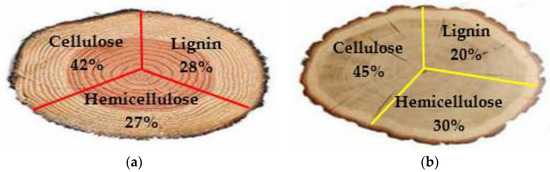 Percentage contents of main constitute of woody biomass in a wood cell. (a) Softwood; (b) Hardwood (adapted from [72]).