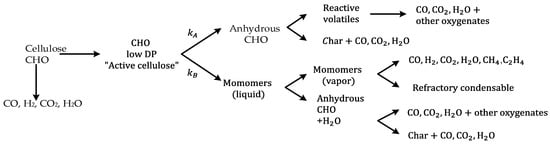 The pyrolytic decomposition of cellulose can be described in two routes, as presented in Figure 9. The first route, kA, is performed at a low temperature and heating rate, and involves dehydration of cellulose to yield an “anhydrocellulose” or (“active cellulose”); the second route, kB, is performed at a higher temperature and heating rate, and results in the depolymerization of cellulose to yield primarily laevoglucose, with minor amounts of other anhydromonosaccacharides [76]. It has been established that low temperature affects the initial process of decomposition and results in a reduction in the degree of polymerization and the formation of “anhydrocellulose” or “active cellulose” However, at a high temperature and high heating rates, decomposition of cellulose is expressed by two competitive degradation reactions, the first essentially to char and gas, and the second essentially to tars [77]. Thus, decomposition of cellulose at a high temperature and high heating rates has become the major decomposition route of cellulose [76].