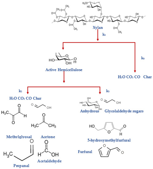 Hemicellulose is a random, amorphous structure rich with branches, which surround the cellulose fibers and link them together [78]. Hemicellulose is composed of various saccharides (glucose xylose, mannose, arabinose, and galactose). The contribution of hemicellulose to thermal pyrolysis is different from cellulose because the crystalline structure of cellulose has to be disrupted thermally to free the carboxyl groups at a certain temperature, whereas the hemicellulose chains are amorphous and disrupted at a lower temperature [16,79]. The degradation of hemicellulose mainly happens at a low temperature and the major weight loss occurs at 220–315 °C with higher CO2 and char yields [80,81,82]. However, the maximum weight loss has been observed at 310 °C [23]. A study on the mechanism of hemicellulose reported that the formation of main products occurs via decomposition of three types of structural units in hemicellulose [83]. Huang et al. [84] studied the monosaccharide xylan. They reported that a major weight loss of xylan occurred at 220–315 °C with a wide variety of products. The decomposition of hemicellulose during pyrolysis is presented in Figure 10.