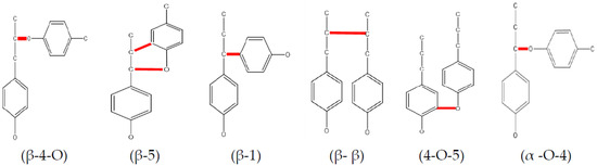 Lignin is considered to be the main waste stream from several biochemical processes which aim to specifically separate the cellulose and hemicellulose including bioethanol production and the pulp industry. Lignin is also considered to be a rich source of aromatic compounds, polymers, and chemical products [28]. The polymerization of p-coumaryl, coniferyl, and synapyl alcohols has led to the formation of lignin. Hence, the main units representing the lignin structure are p-hydroxyphenyl propane (p-H), guaiacyl (G), and syringyl (S), as presented in Figure 3. The vast majority of lignin bonds are represented by 4-O-β bonds. The lignin composition is different based on the feedstock, i.e., softwood is mainly composed of guaiacyl (G) units with very few units of p-hydroxyphenyl, whereas hardwood species are rich with guaiacyl (G) and syringyl (S).